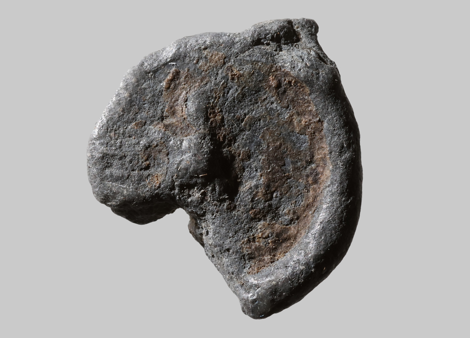 Unförmige Plombe mit rundem Stempel; Victoria nach rechts schreitend, Arme vor sich gestreckt und in einer Hand runden Gegenstand haltend; links Flügelansätze erkennbar; hinten senkrechte Durchlochung; Motiv kaum erkennbar