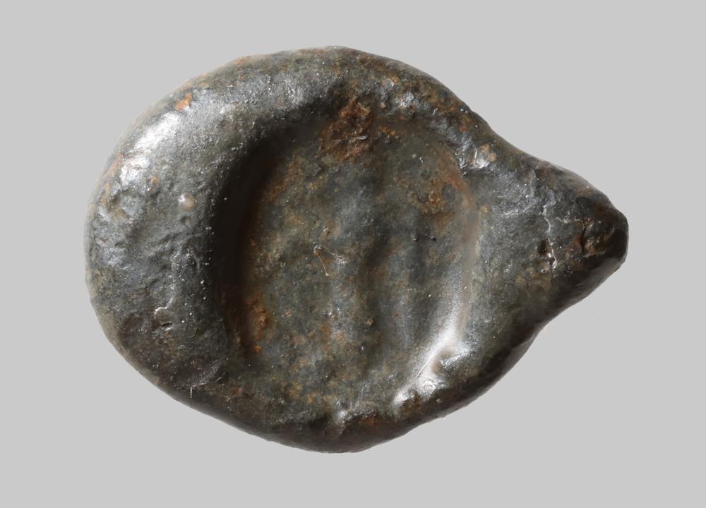 Unförmige Plombe mit ovalem Stempel; stehende Figur, auf rechten Seite Füllhorn auf linkem Arm haltend und auf linken Seite rechte Hand vor sich Steuerruder haltend; hinten senkrechte Durchlochung