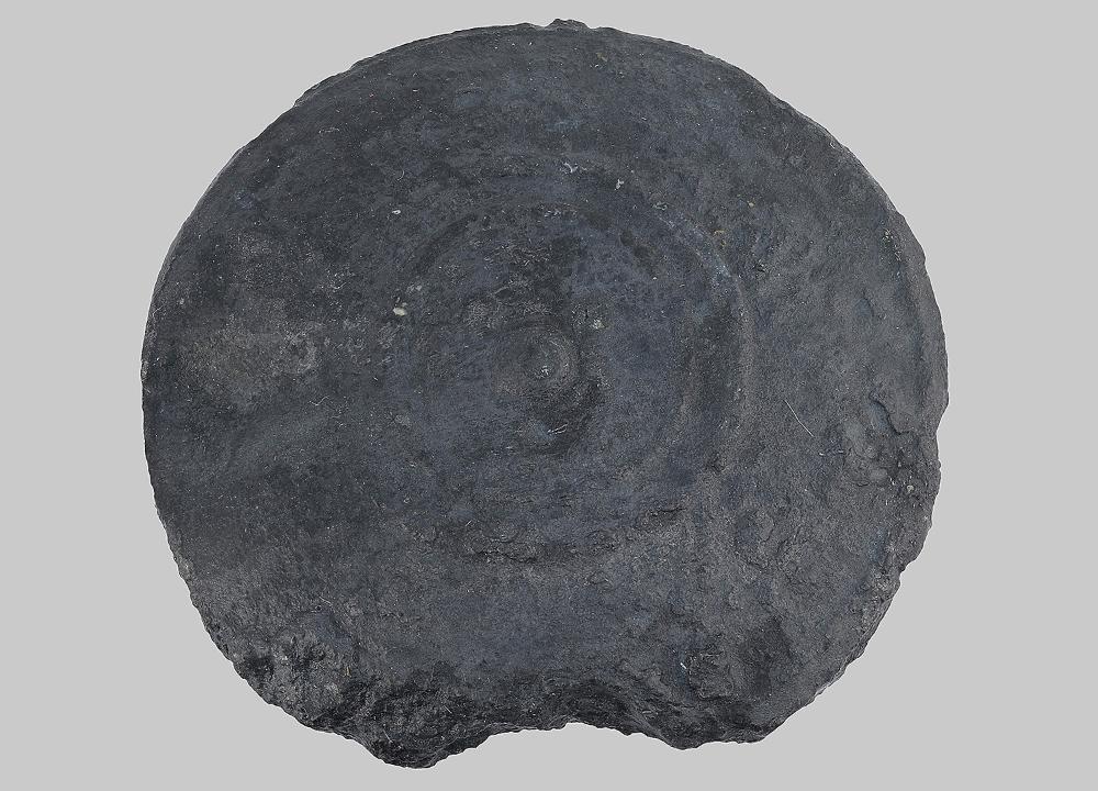 Plankonvexes, scheibenförmiges Objekt mit einer Noppe und zwei konzentrischen Kreisen in der Mitte.