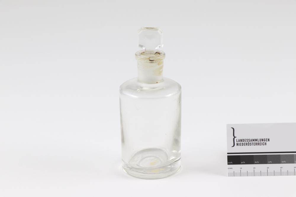Zylinderförmige Flasche mit kurzem Hals, gerader Wandung und massivem Schliffstopfen mit facettierter Handhabe. Das zugehörige Holzetui fehlt.