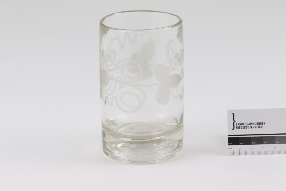 Rundes Trinkglas mit gerader Wandung. Vegetabiler Dekor graviert.