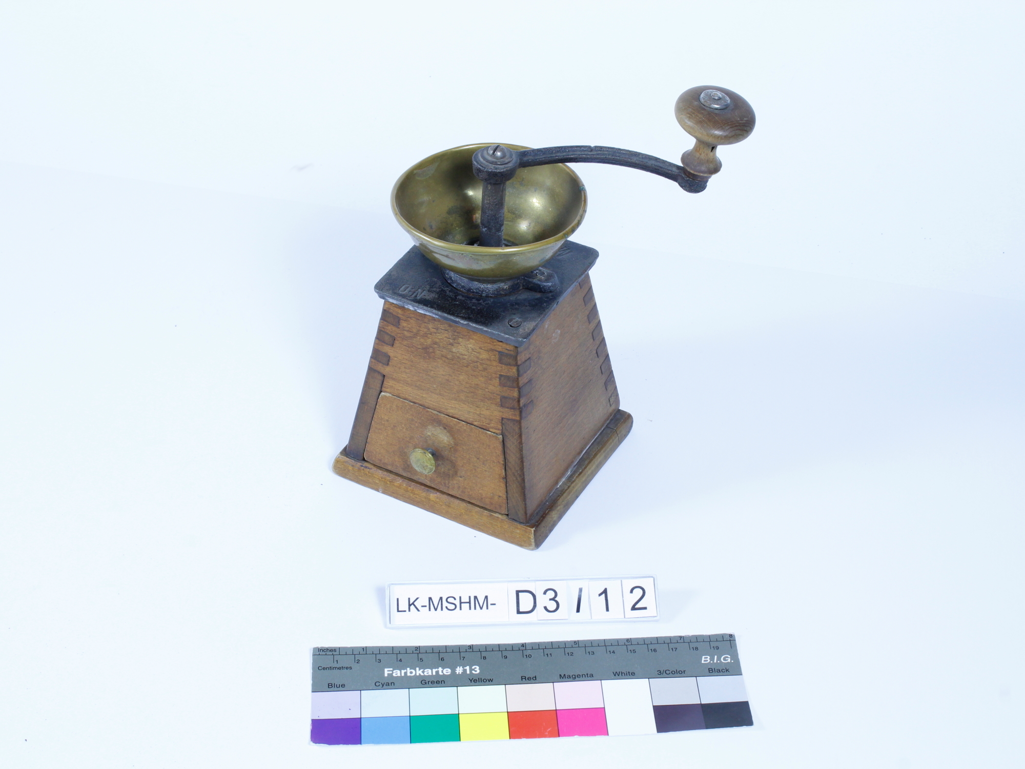 Kaffeemühle aus Holz mit Lade. Einfülltrichter aus Messing.