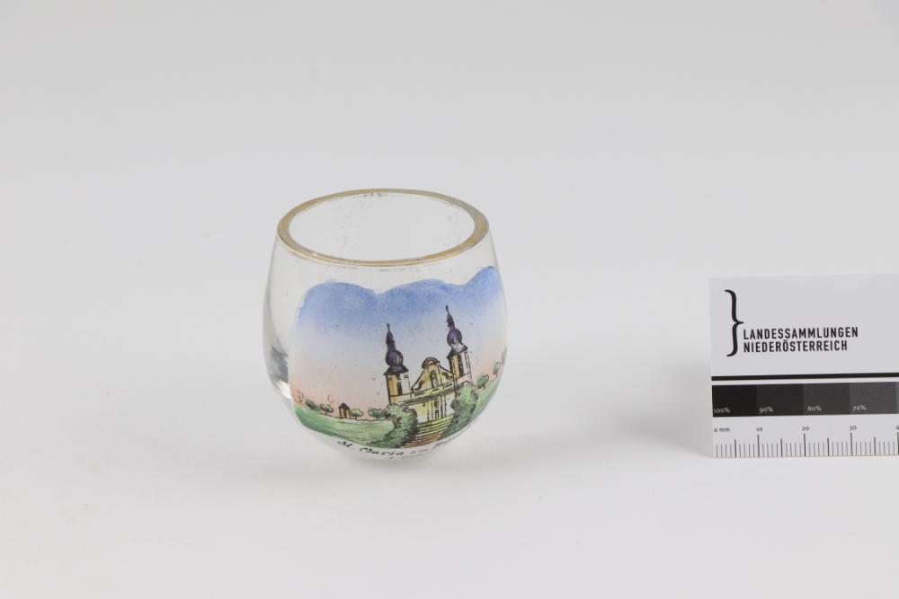 Material/TechnikGlas (farblos), geblasen, geschliffen, im Umdruckverfahren zweifarbig bedruckt und polychrom bemalt, Glanzgoldauflage