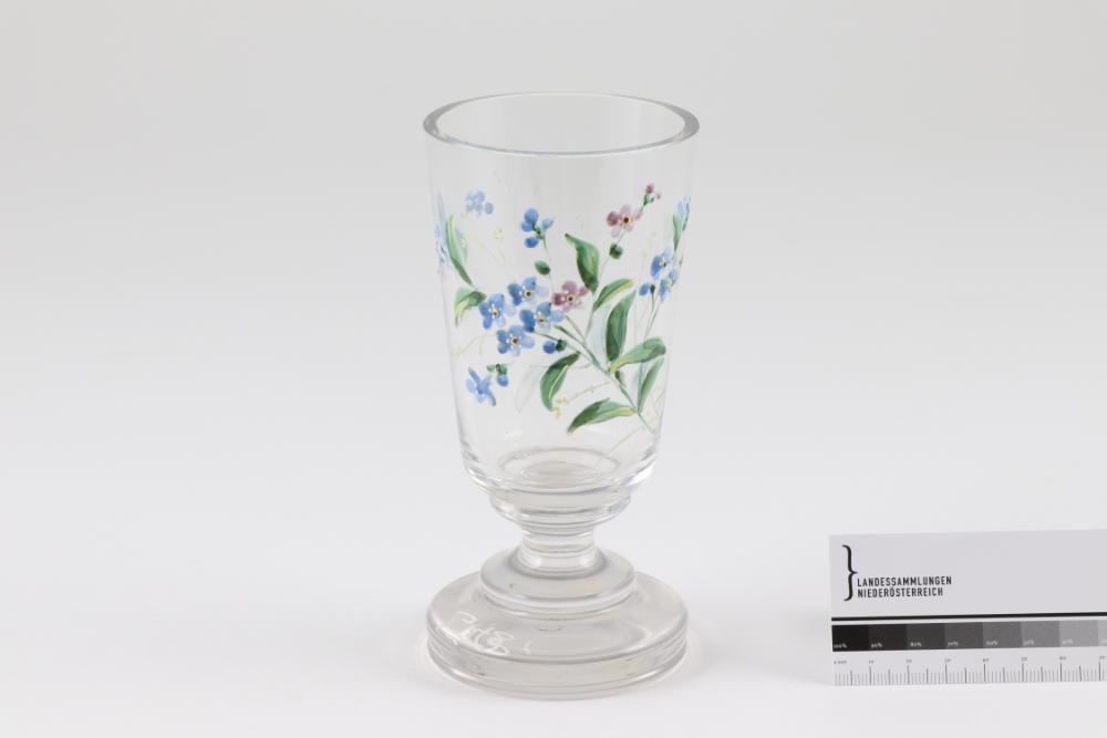 Material/TechnikGlas (farblos), geblasen, geschliffen, mit Emailfarben polychrom bemalt, Glanzgoldauflage