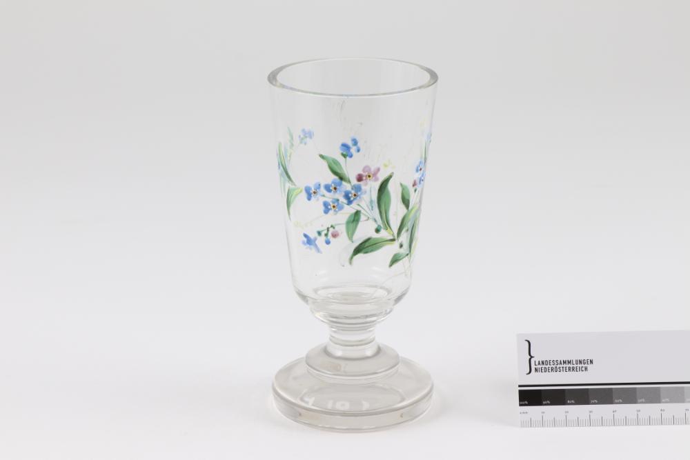 Material/TechnikGlas (farblos), geblasen, geschliffen, mit Emailfarben polychrom bemalt, Glanzgoldauflage