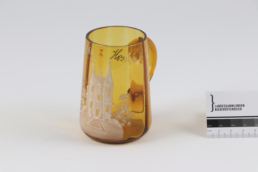 Runder Humpen mit leicht gebauchter, nach oben zulaufender Wandung und inwändig geraden Faltenzügen. Motiv (Wallfahrtskirche/Basilika in Hostein/Hostýn) in Weiß gemalt. Aufschrift in Glanzgold gemalt.