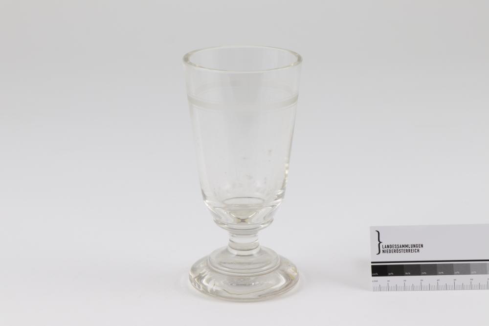 Rundes Teeglas mit konischer Wandung. Linearer Dekor geätzt.