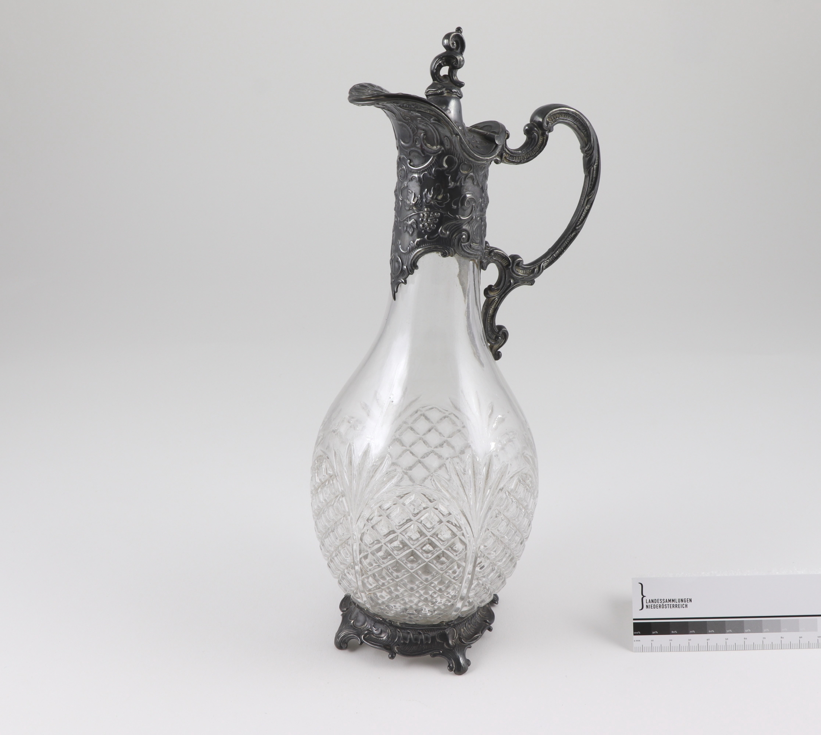 Runde Karaffe mit gebauchter Wandung und geometrischem Ornament. Montierungen am Stand mit Rocaillen und ausgestellten Füßen, am Rand mit geschwungenem Henkel, Schnaupe mit vegetabilem Ornament und Verschluss mit Handhabe in Form einer Rocaille aus versilbertem Neusilber.