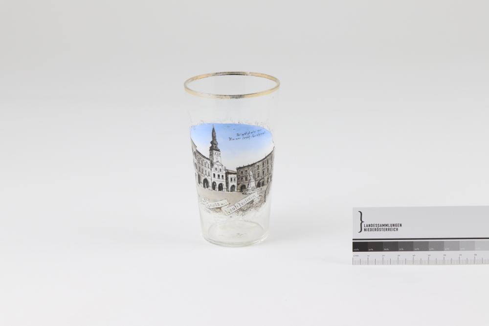 Rundes Trinkglas mit konischer Wandung. Motiv (Stadtplatz in Neutitschein/Nový Jičín gegen Osten) sowie Aufschrift und florales Dekor in Schwarz und Weiß umgedruckt und in Blau bemalt. Linearer dekor in Glanzgold gemalt.