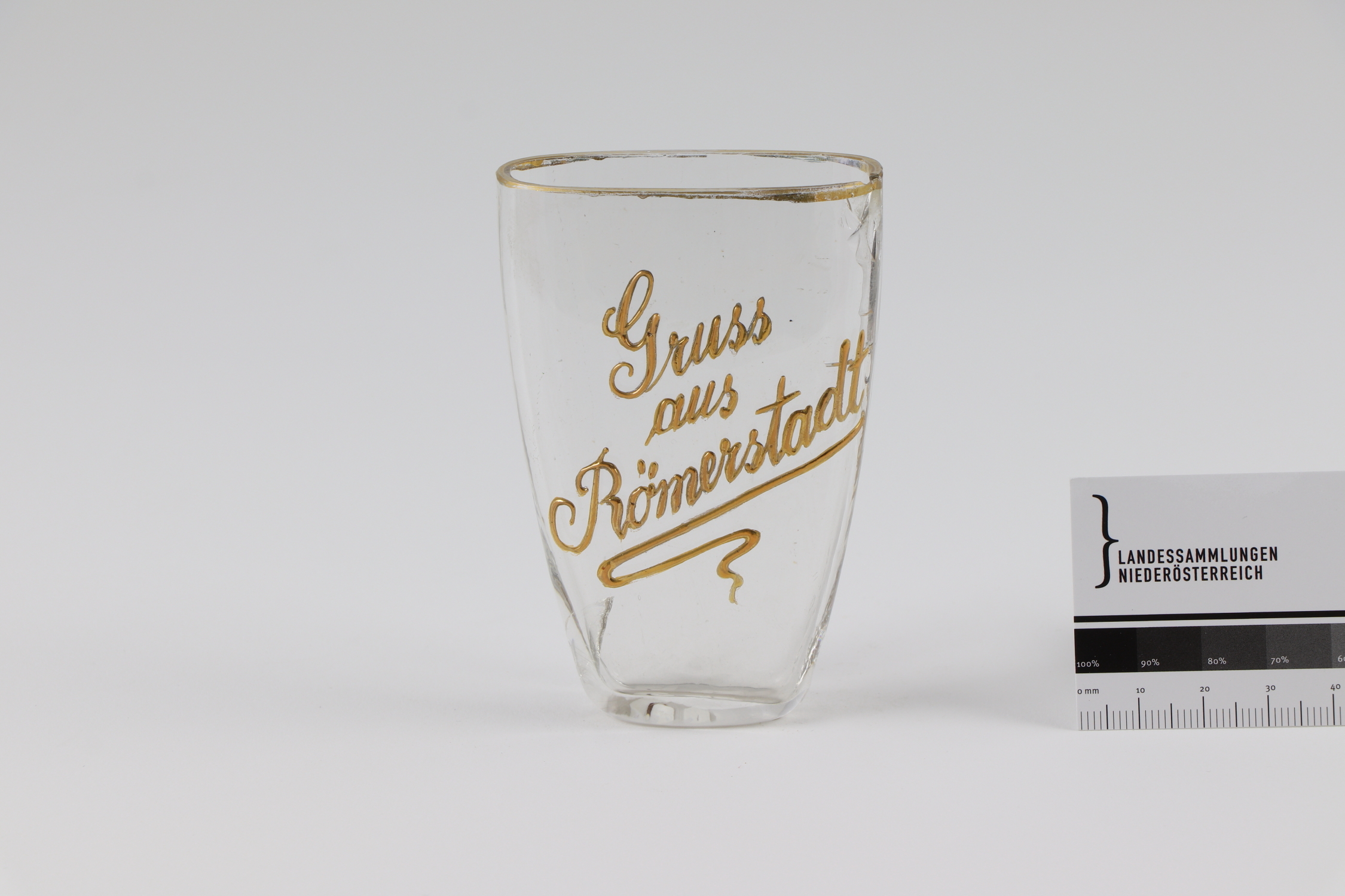Material/TechnikGlas (farblos), zum Teil in Model geblasen, geschliffen, irisierend gelüstert, Glanzgoldauflage