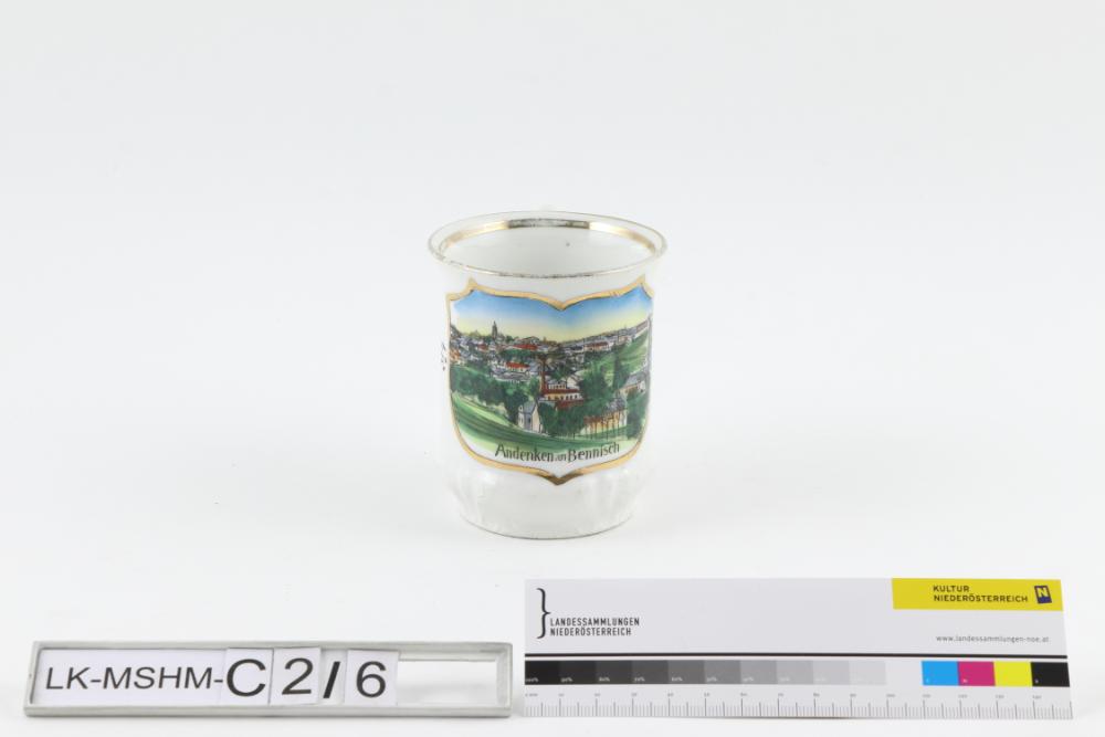 Runde Tasse mit gerader Wandung und ausgestelltem Rand. Motiv (Ansicht von Bennisch/Horní Benešov) in Schwarz umgedruckt und mit Grau, Blau, Grün, Gelb, Ocker und Rot sowie Glanzgold bemalt. Linearer Dekor in Glanzgold umgedruckt.