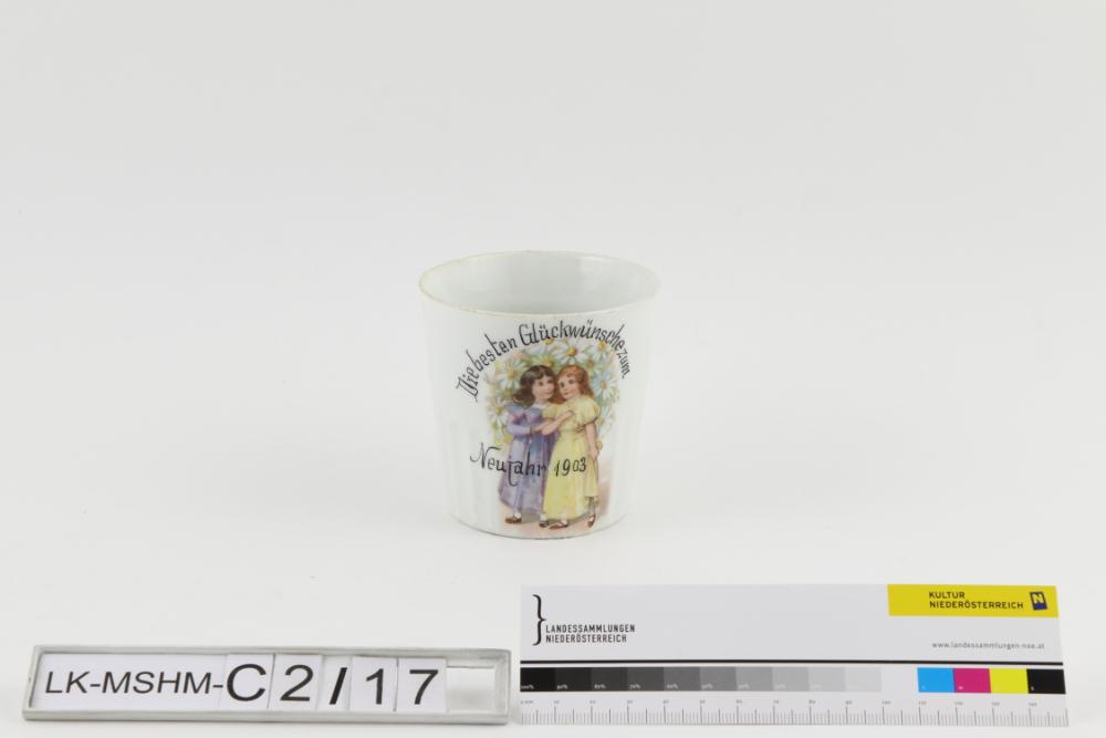 Material/TechnikPorzellan (weißer Scherben), farblos glasiert, auf Glasur im Umdruckverfahren bedruckt, mit Schwarzlot beschriftet