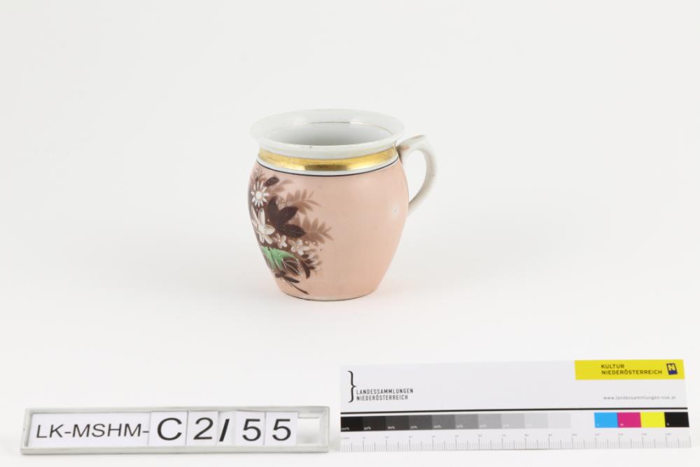 Runder Tasse mit gebauchter Wandung und ausgestelltem Rand. Floraler und linearer Dekor in Schwarz, Ocker und Gün auf rosa Fond gemalt. Linearer Dekor in Glanzgold gemalt.