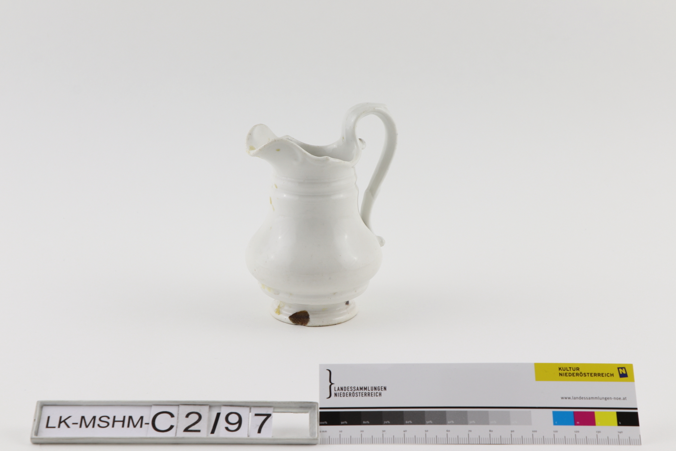 Rundes Kännchen mit gebauchter Wandung, überrandständigem Henkel und geschwungener Schnaupe.