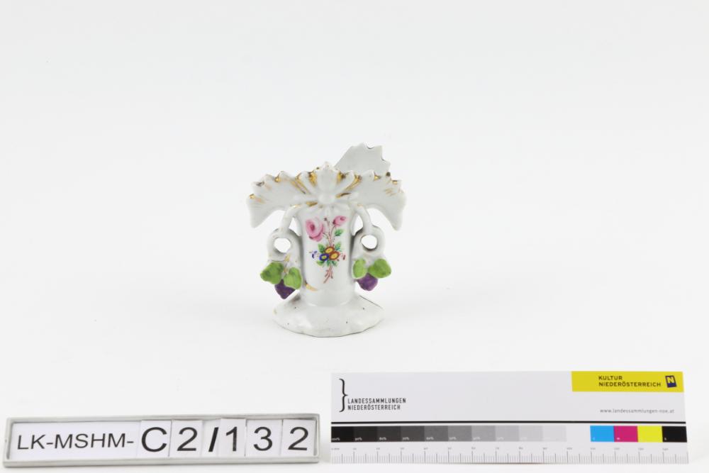 Material/TechnikPorzellan (weißer Scherben), farblos glasiert, auf Glasur polychrom bemalt, Glanzgoldauflage