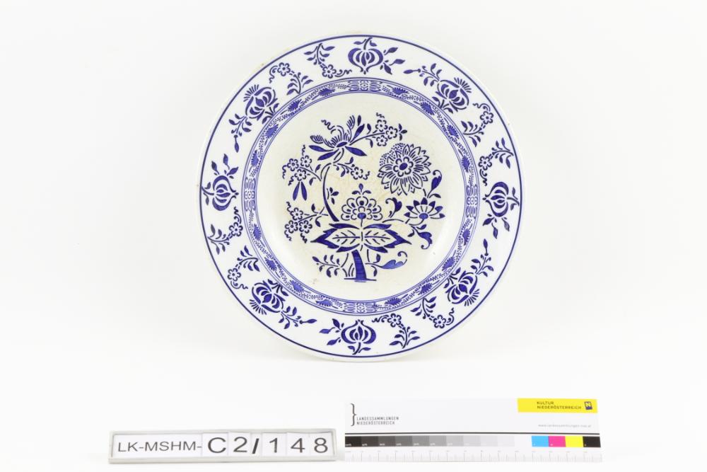 Runder Suppenteller. gemaltes Zwiebelmuster in Kobaltblau.