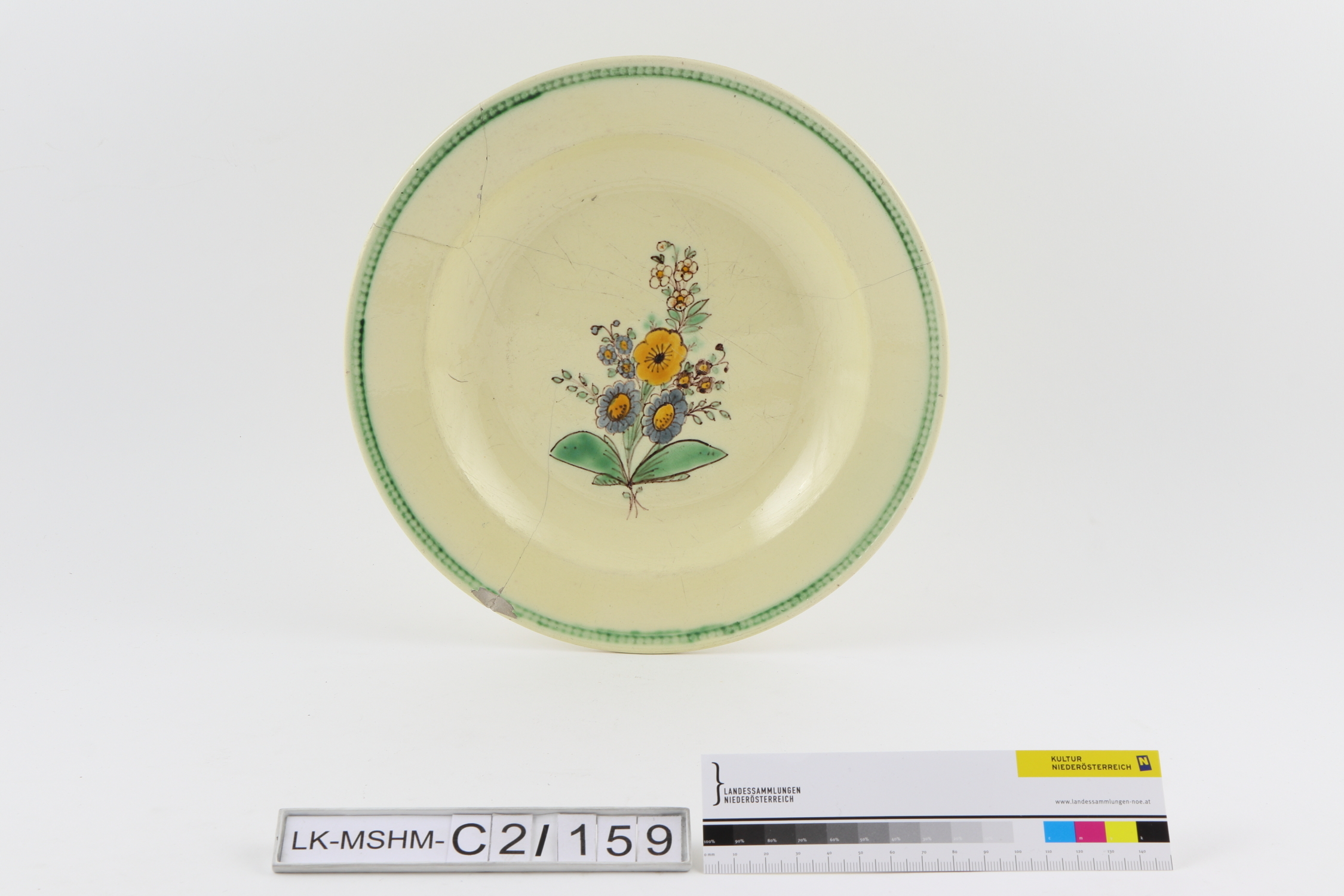 Runder Speiseteller. Geometrischer Dekor auf Fahne in Grün umgedruckt, Florales Dekor in Schwarz (Schwarzlot), Blau, Grün und gelb gemalt.