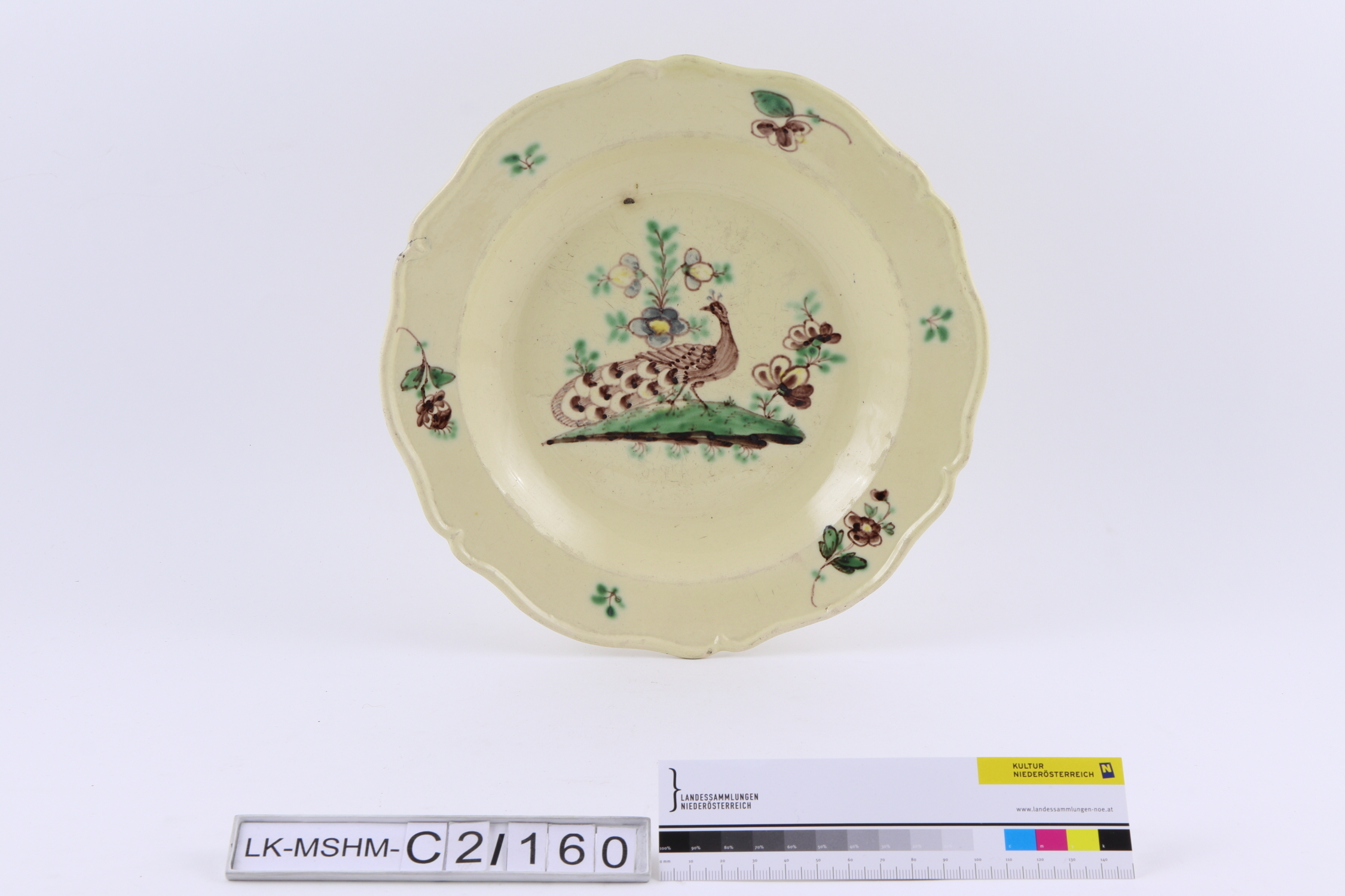Speiseteller mit gewelltem Rand. Vegetabiler Motiv und florales Dekor in Schwarz (Schwarzlot), Blau, Grün und Gelb gemalt.