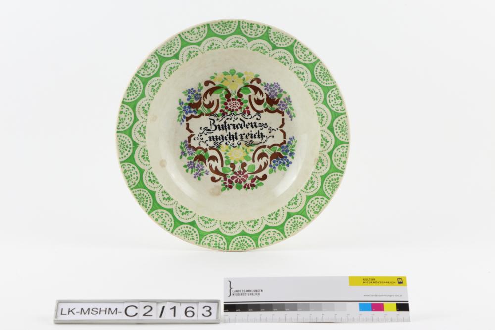 Runder Suppenteller. Geometrischer und vegetabiler Dekor sowie Aufschrift in Schwarz, Grün, Gelb, Braun, Magenta und Violett durch Schablone gemalt.