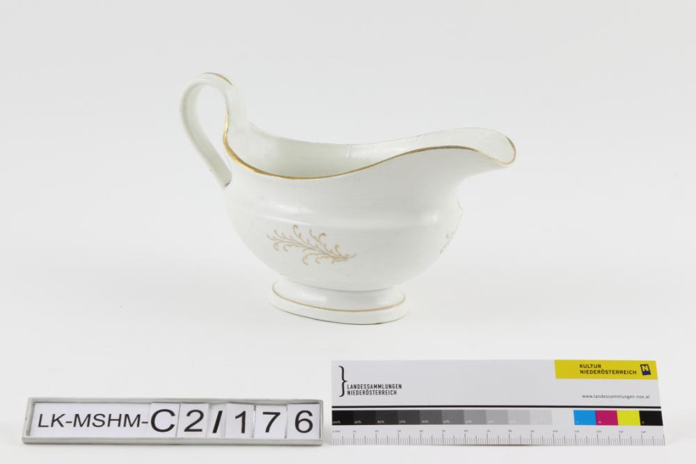 Sauciere ohne Untertasse, oval fassoniert, mit geschwungener Schnaupe und überrandständigem Henkel. Vegetabiler und linearer Dekor in Glanzgold gemalt.