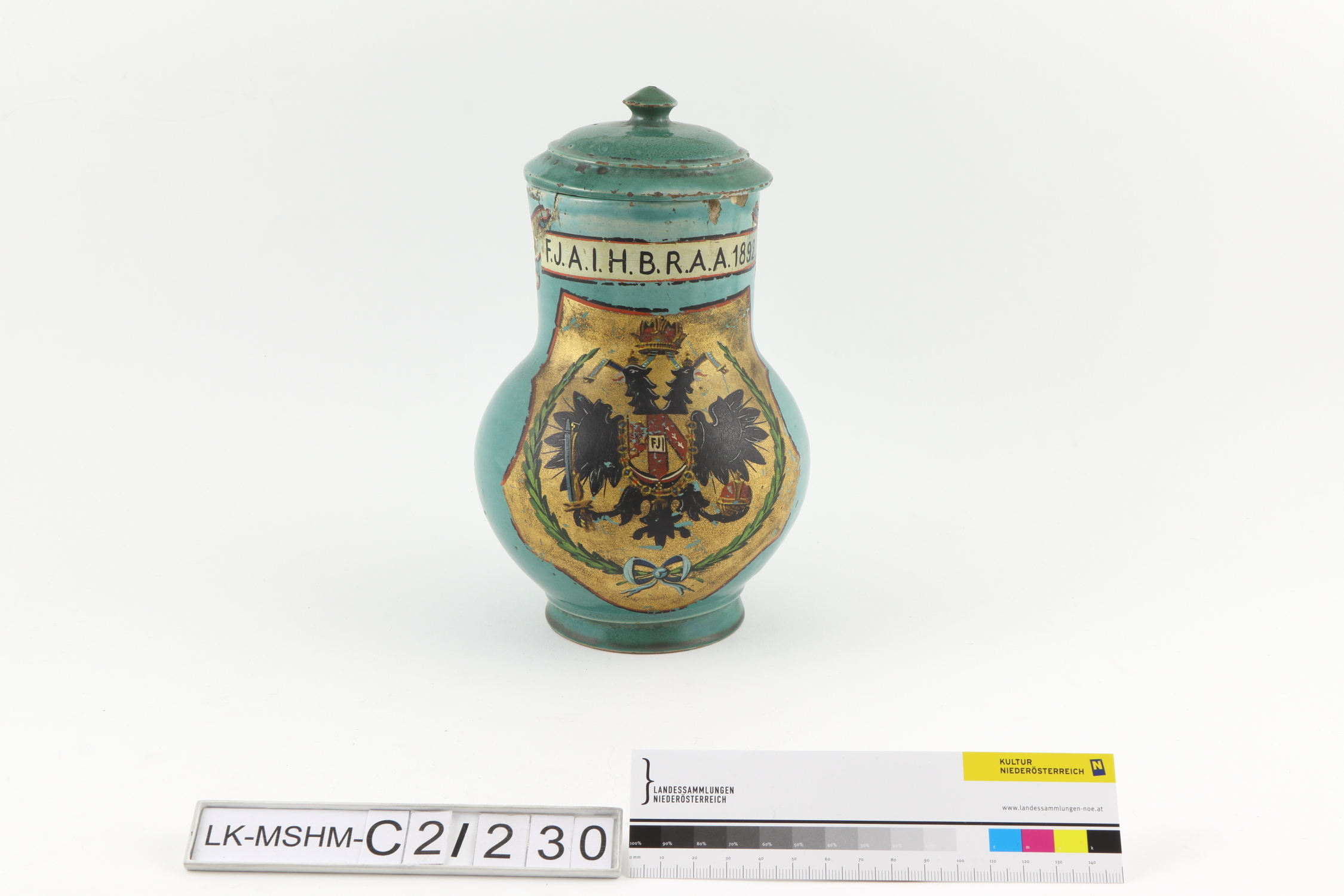 Runder, bauchiger Krug mit Henkel und Deckel ohne Schnaupe. Ölmalerei in Schwarz, Blau, Grün, Rot und Weiß auf ölvergoldetem Fond (Doppeladler, Wappen des Hauses Habsburg) sowie gemaltes Titulaturschild