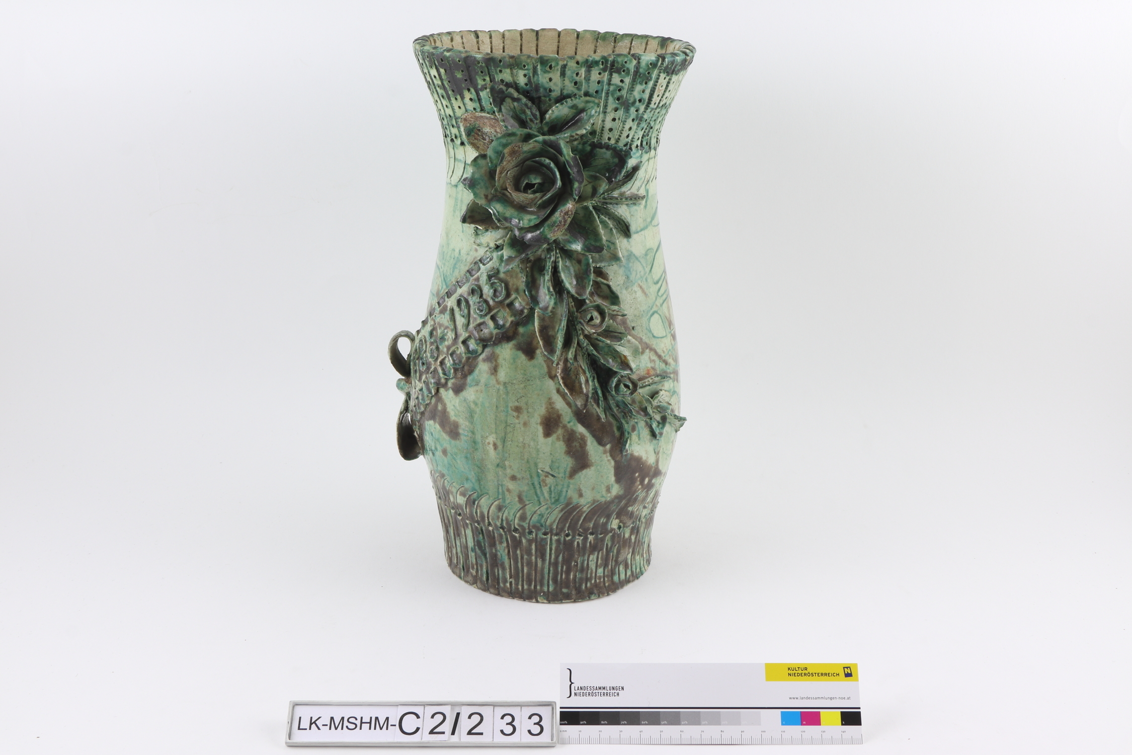 Runde bauchige Vase mit plasischer, floraler Ornamentierung. Band mit Jahreszahlen