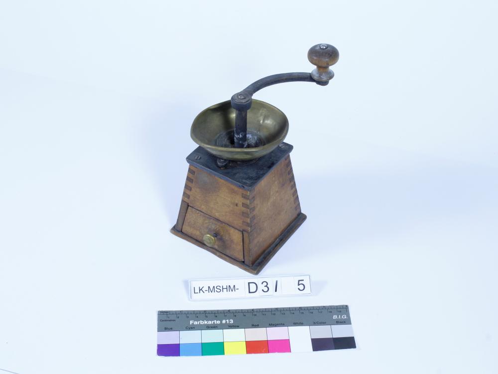 Kaffeemühle aus Holz mit Lade. Einfüllstutzen aus Messing.