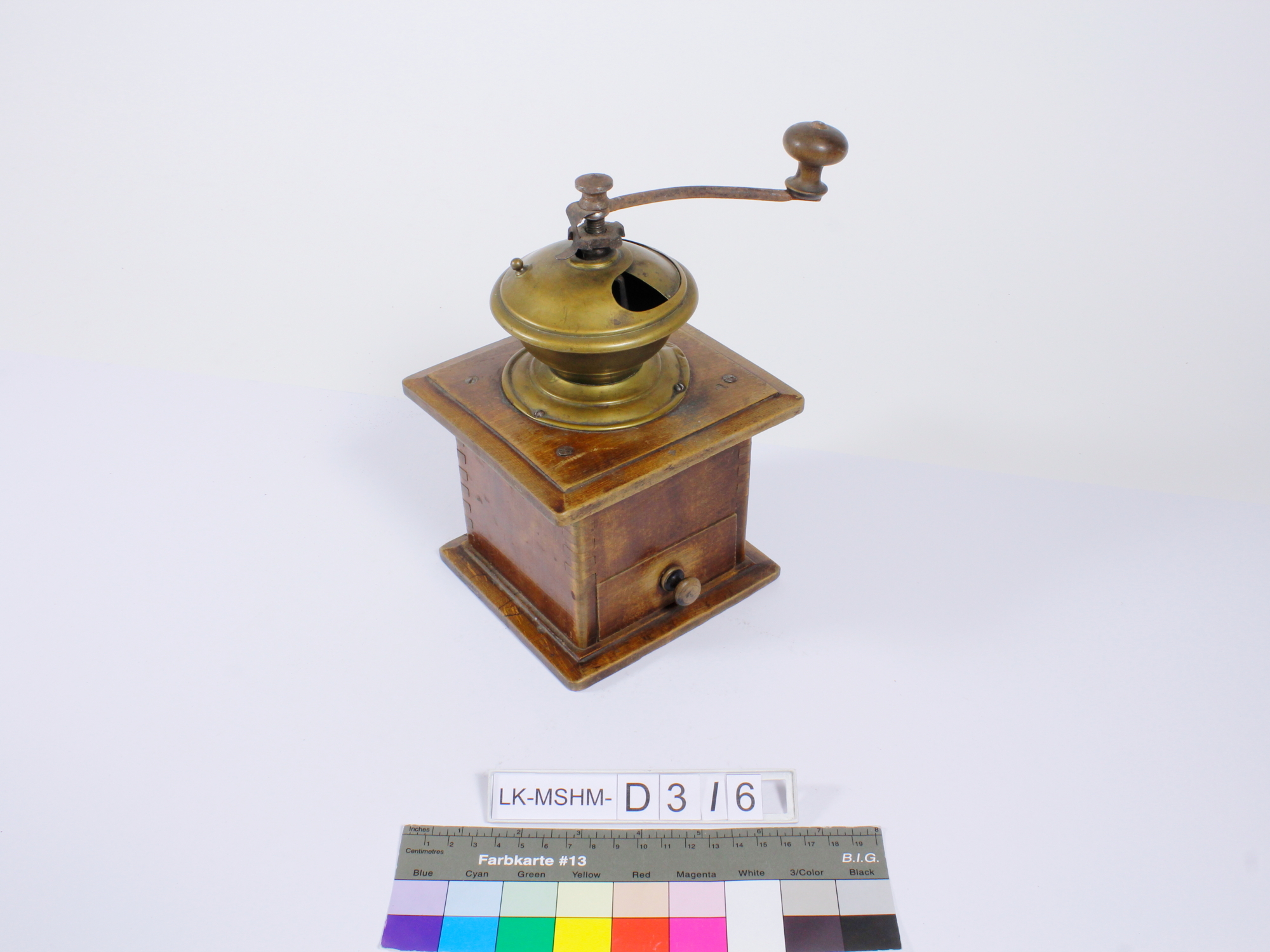 Kaffeemühle aus Holz mit Lade. Einfüllstutzen aus Messing.