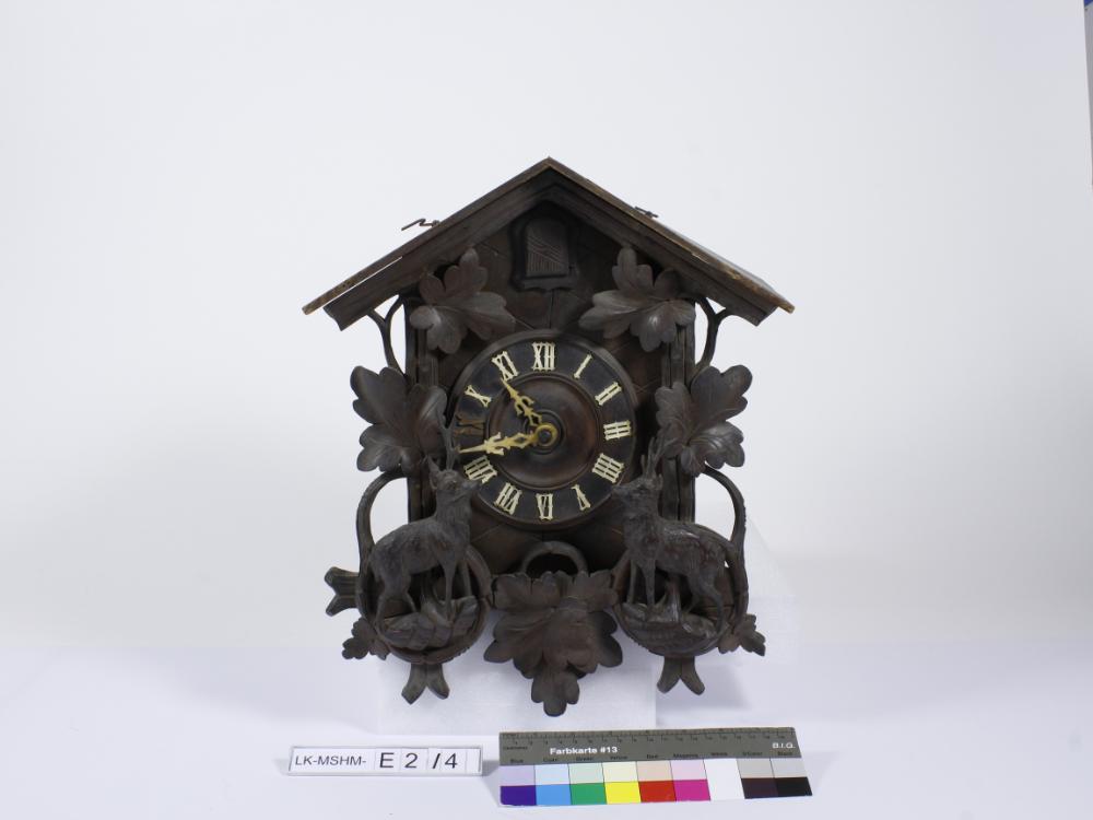 Kuckucksuhr mit Gewichtantrieb über Kettenzug für Geh- und Schlagwerk. Schottenwerk mit Hakenhemmung und Schlagfolgensteuerung mittels Schlossscheibe. Mechanischer Kuckuck hinter geschnitzt Tür im Giebelfeld, Tonerzeugung über zwei auf Terz gestimmte Holzlabialpfeifen, zusätzlicher Schlag auf Tonfeder. Gehäusefront und Pendel aus Obstholz, geschnitzt, durchbrochen und gebeizt. Ziffern und Zeiger aus Bein geschnitzt. Giebelzier, Gewichte, Pendel fehlen.