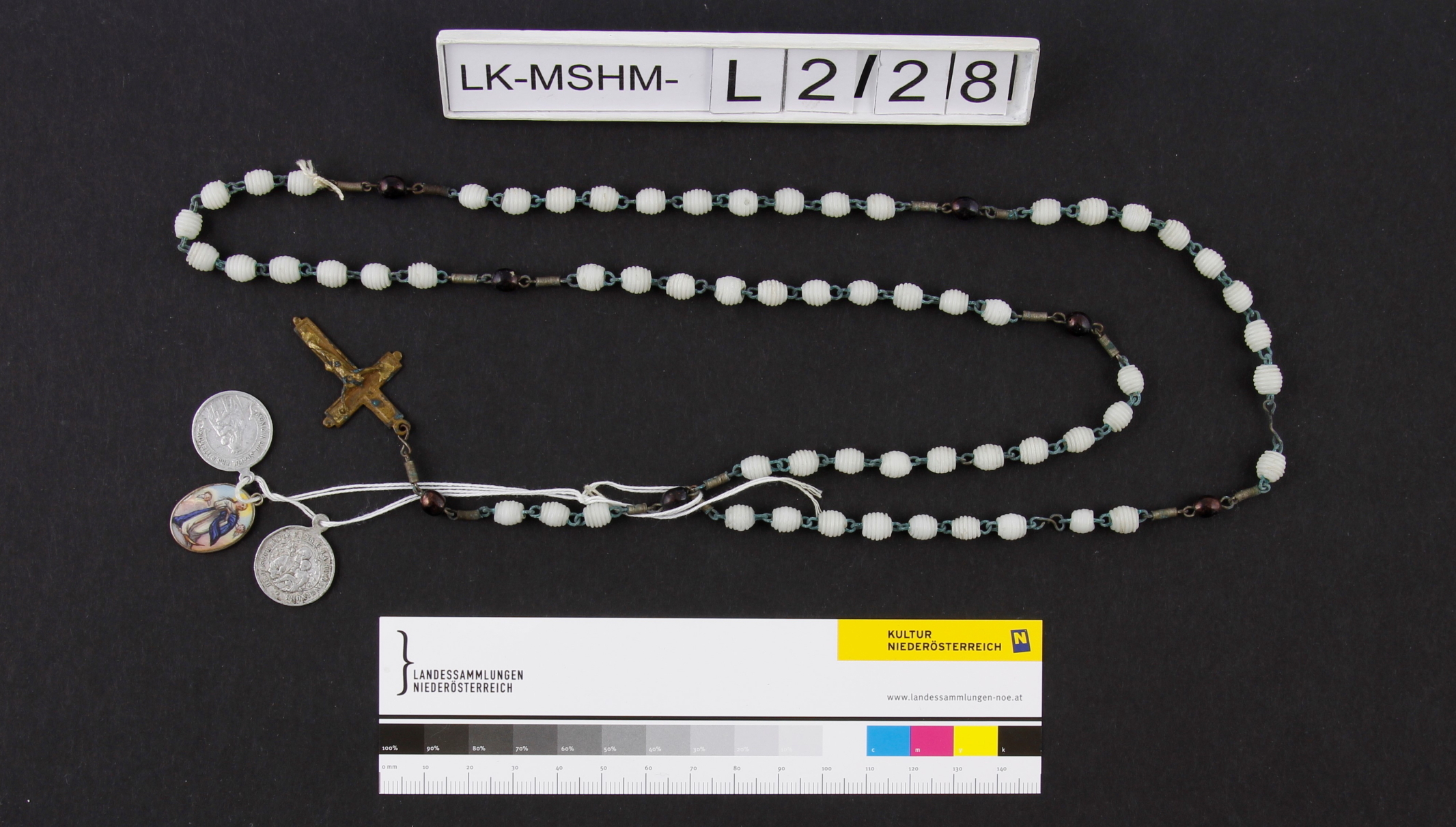 Missionskreuz aus Messing. Drei einzelen Anhänger: "Sancta Maria, ora pro nobis!" bunt, oval zwei runde Marienanhänger aus silber.