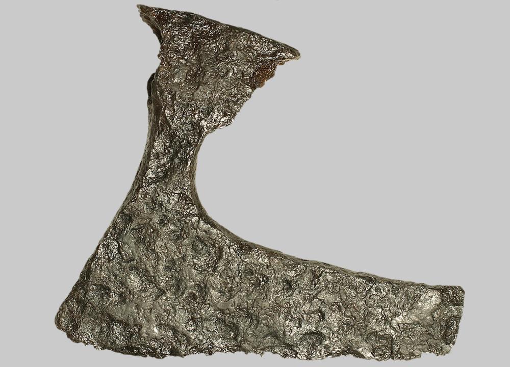 Beidseitig verlängerter Nacken. Ovales Schaftloch mit Holzresten. Geschwungenes Blatt endet oben in einer von Schneide und Rücken gebildeten Spitze. Gerader unterer Bartabschluss.