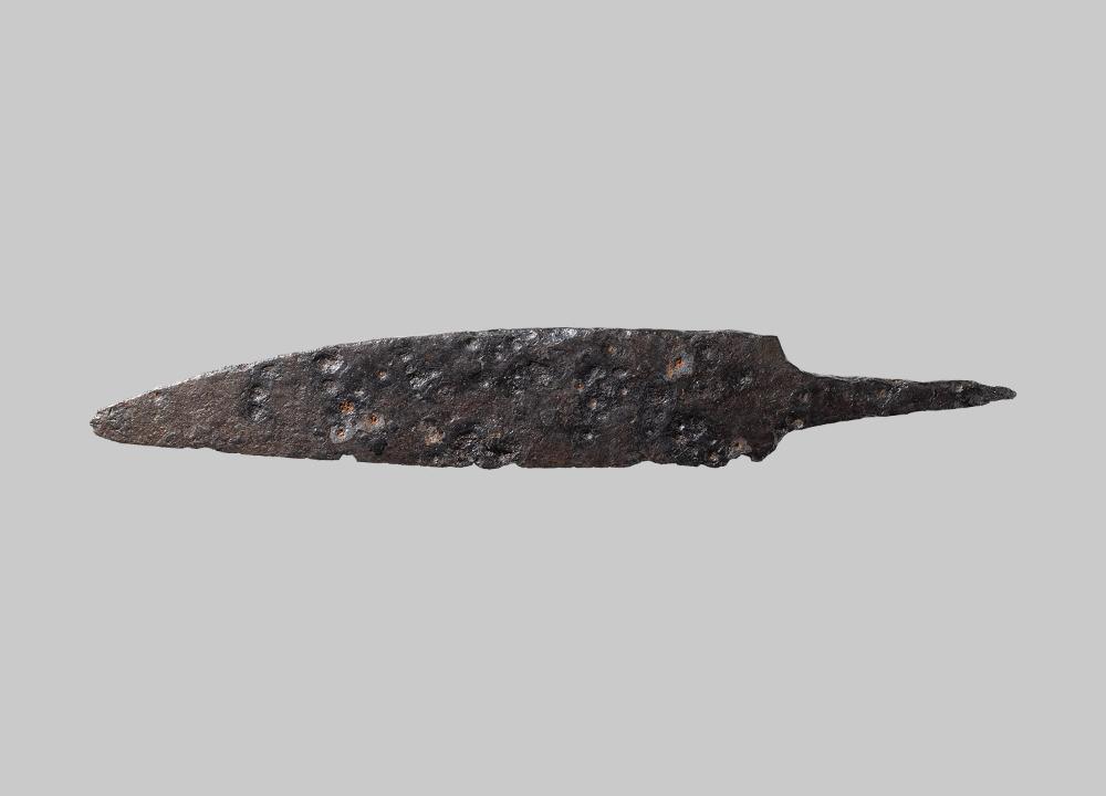 Messer mit fragmentierter, mittelständiger Griffangel und gebogenem Rücken. Die Schneide und Spitze sind abgebrochen.