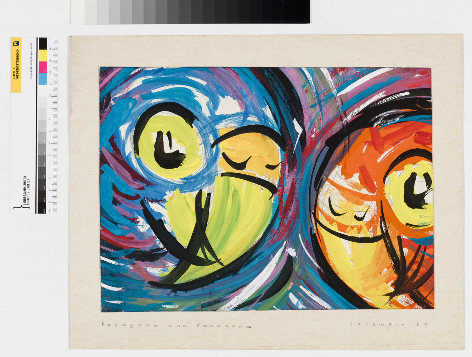 SignaturTrägekarton: VS. li. unten bet., re. unten sign. u. dat.: "Papageno und Papagena, Gesswein 59"