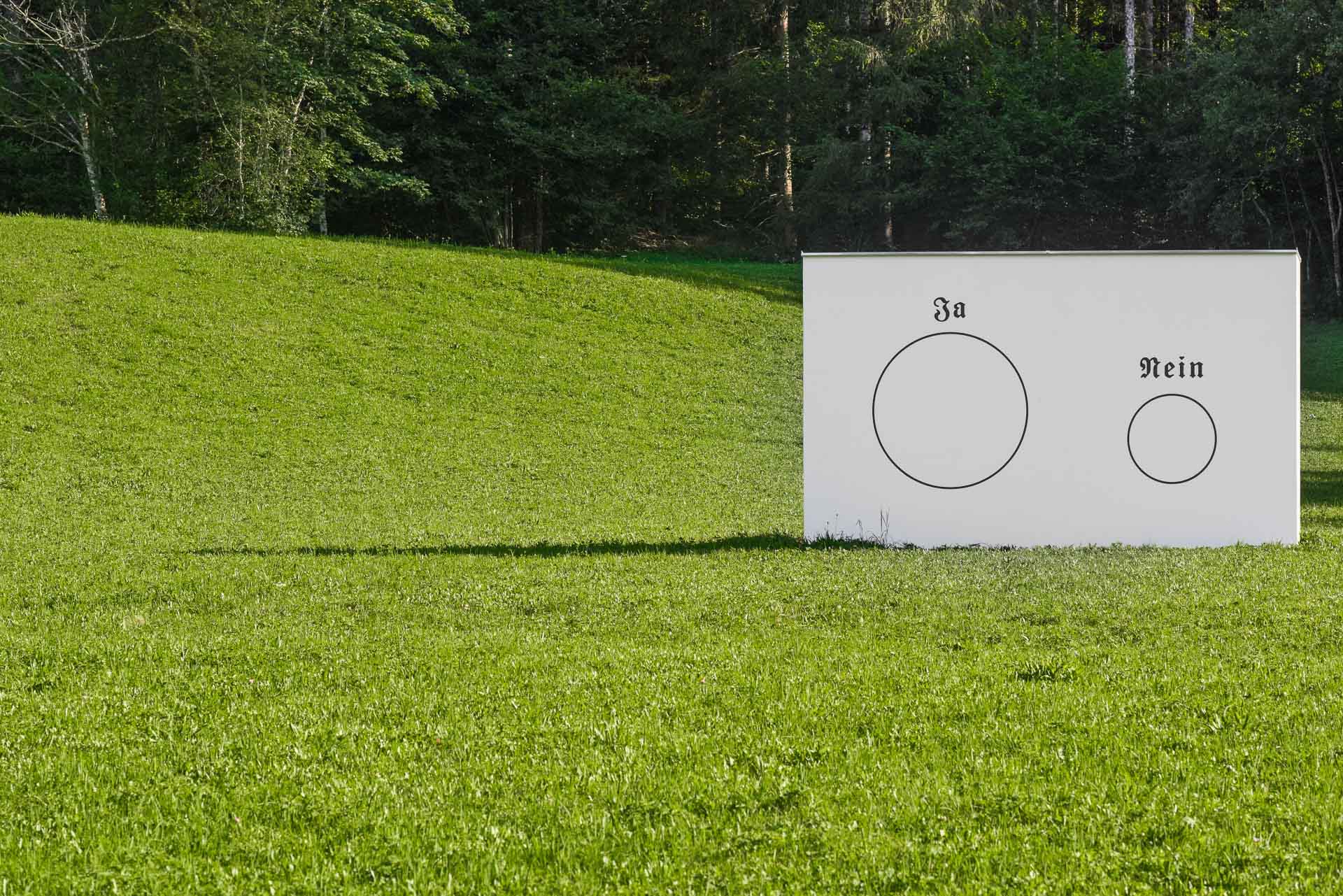 Die schlichte, doch weit sichtbare Markierung von Florian Pumhösl inmitten der Narzissenwiese ordnet die Geschehnisse in und um Lunz während des Dritten Reiches in einen größeren Zusammenhang ein. Pumhösl weist damit auf eine gesamtgesellschaftliche Verantwortung hin, die jede Generation von neuem tragen muss. Das Wandbild ist bewusst auf die beiden für die Abstimmung verwendeten Wahlmöglichkeiten reduziert: ein großer Kreis dem Ja und ein kleiner Kreis dem Nein. Einzig die verwendete Frakturschrift verweist auf die historische wie politische Dimension des Bildes und macht sie gleichzeitig unübersehbar. Umgeben von der malerischen Umgebung fügt sich die Wand in die Landschaft und bricht gleichzeitig aus ihr heraus – macht Bewohner*innen wie Besucher*innen bewusst, dass Verantwortung füreinander nirgends aufhört und demokratische Rechte immer geschützt werden müssen, weil sie kein natürlicher Umstand, sondern ein von Menschen erkämpftes Gut sind.