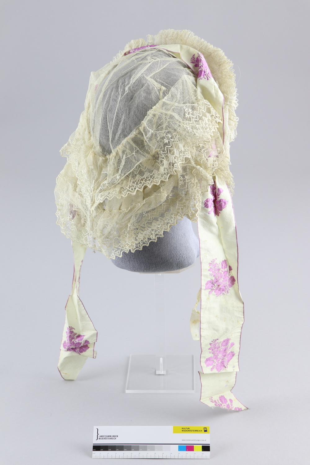 Weiße Haube aus Tüllspitze, im Nacken dreilagig, Haubenkante mit doppelter Spitzenrüsche. Weißes Seidenband mit violetten Blumen und Rändern liegt gefalten über der und läuft in Bindebänder aus. Haubenkanten und Nackenverlängerung ist Drahtverstärkt.