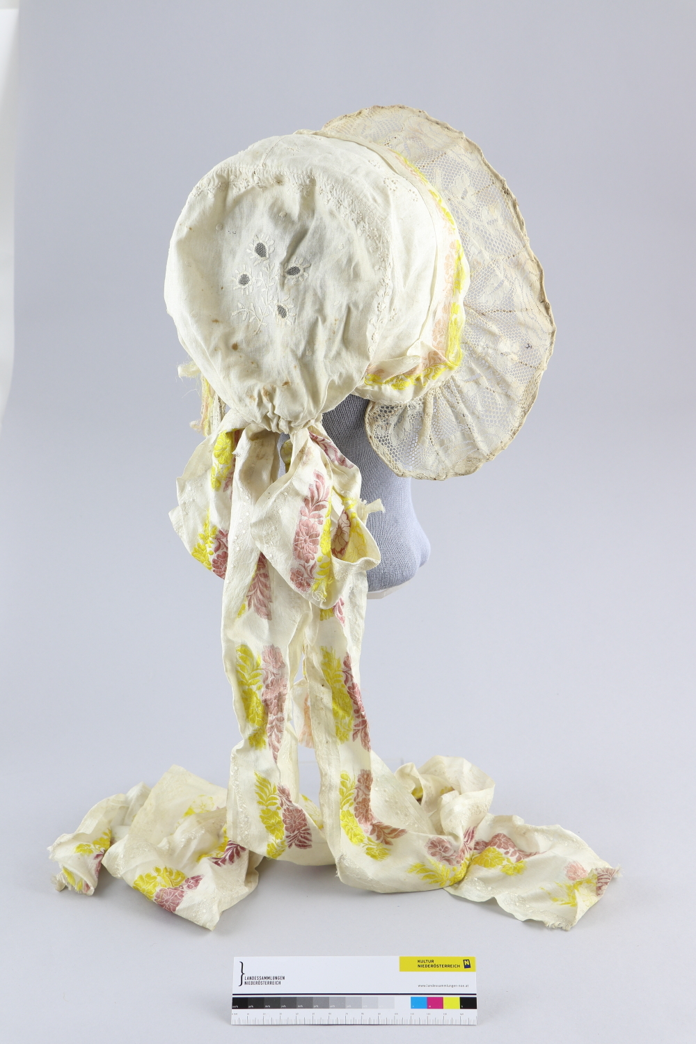 Weiße Spitzenhaube mit besticktem Haubenboden und 2-teiliger Kopfteil aus Leinen, Blumen und Blütenranken, teilweise mit Tülleinsatz. Der Kopfteil ist mit einem 4,5 cm breiten weißem Seidenband mit floralem Muster in Rosa/Gelb besetzt. Der Rüschenbesatz ist aus Tüllspitze mit Drahtgestänge verstärkt. Im Nacken Masche mit langen weißen 9,8 cm breiten Bändern mit floralem Muster in Gelb/Rosa. Kopfteil mit Leinen unterlegt.