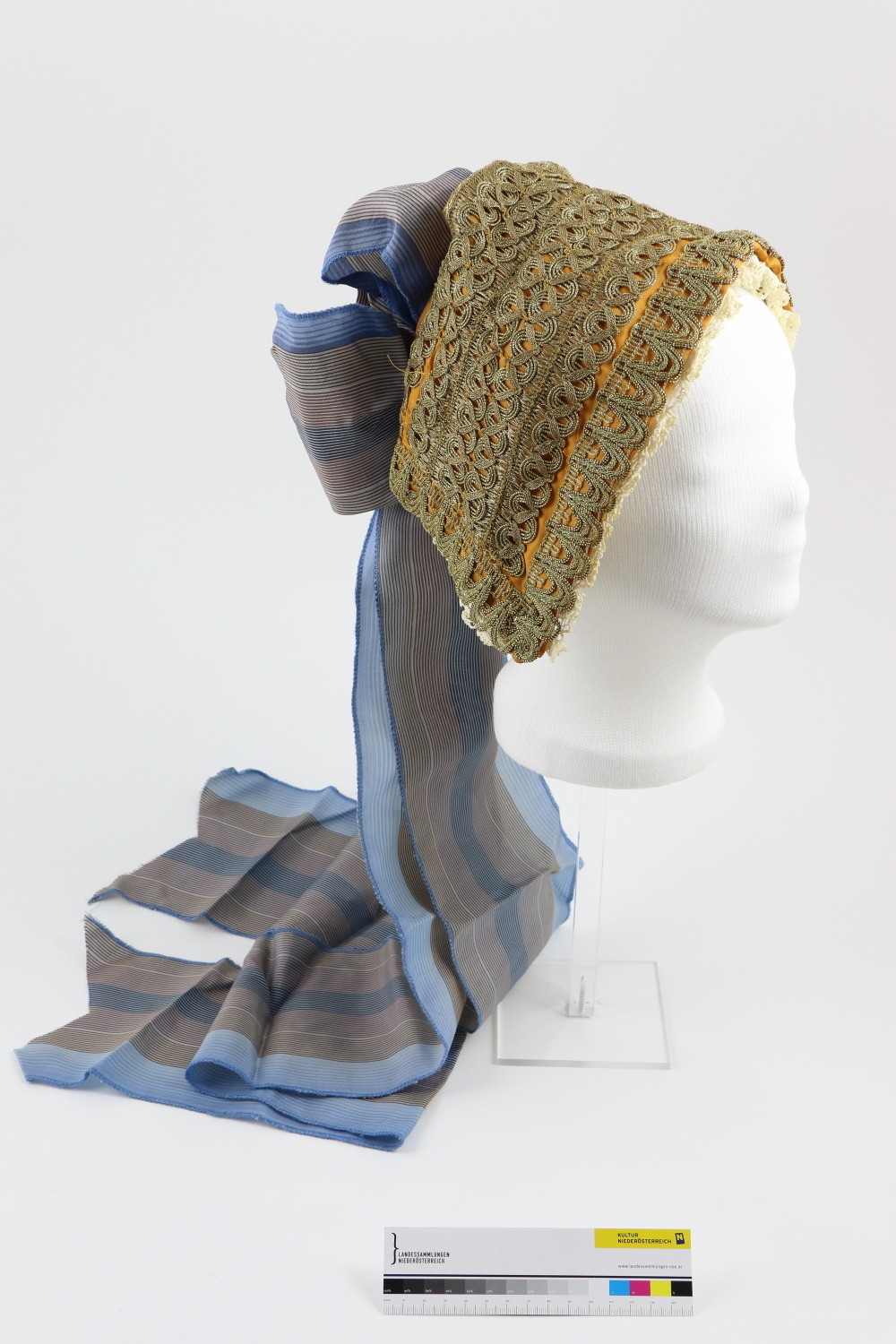 Haube mit rechteckigem Haubenboden, der Kopfteil ist mit mehreren Reihen Goldborten auf orangem Gewebe besetzt. An der Haubenkante eine weiße, in Falten gelegte Klöppelspitze. Im Nacken Masche mit drei Schlaufen und lange Bänder, Blau/Grau gestreift mit versäuberten Kanten. Die dritte Schlaufe ragt in den Haubenboden. Weißes Futter mit Goldborte im Backenbereich. Für einen besseren Halt ist ein Haarreifen eingenäht, die Haubenkante ist mit Draht verstärkt.