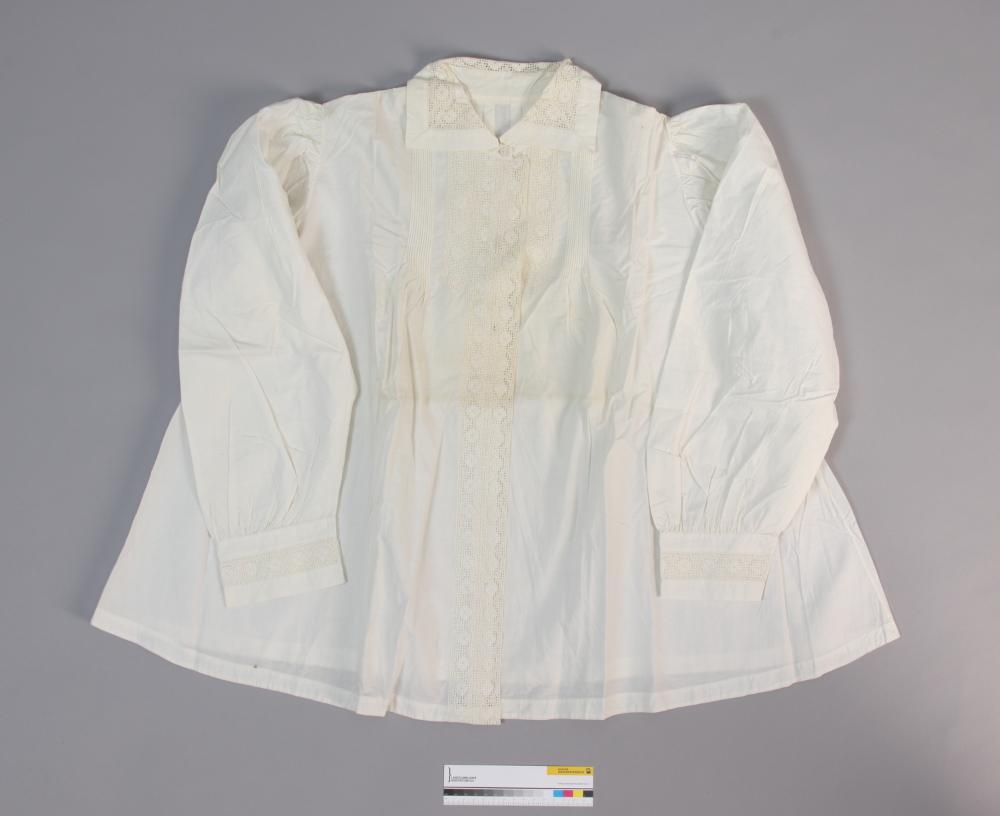 Langärmelige Nachtjacke in Ecru mit Biesen im Vorderteil und Säumchen im Rückenteil, Kragen und Manschetten mit Spitzeneinsätzen, Knopflochleiste zwei- bzw. vierreihig mit Spitze besetzt, drei Zwirnknöpfe.