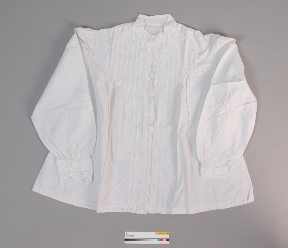 Weiße, langärmelige Nachtjacke mit Biesen im Vorderteil und Stehkragen, Monogramm "RK".