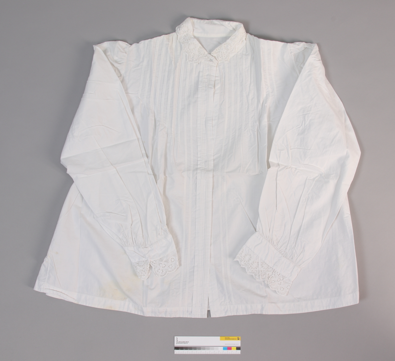 Weiße, langärmelige Nachtjacke mit Biesen im Vorderteil, Spitzenkragen und Spitzenrüsche an den Manschetten, Monogramm "RK", drei Zwirnknöpfe.