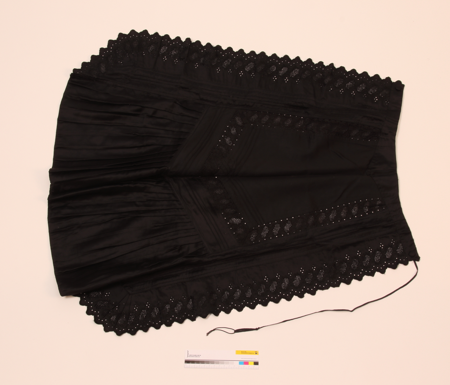 Schwarze Schürze mit Spitzeneinsätzen, Säumchen und plissiertem Volant, seitlich mit Spitze eingefasst. An den Bundenden überzogene Knöpfe.