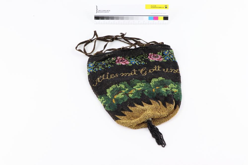 Perlenbeutel mit Schriftzug: "Alles mit Gott und Waidmannsheil" und floralen Bordüren (Blätterranke und Blumenranke mit Rosen) auf schwarzem Grund. Vielteiliges schwarzes Taftfutter, Quaste am Beutelboden in Schwarz und Silber. Am Eingriff Metallringe für das braune Zugband.
