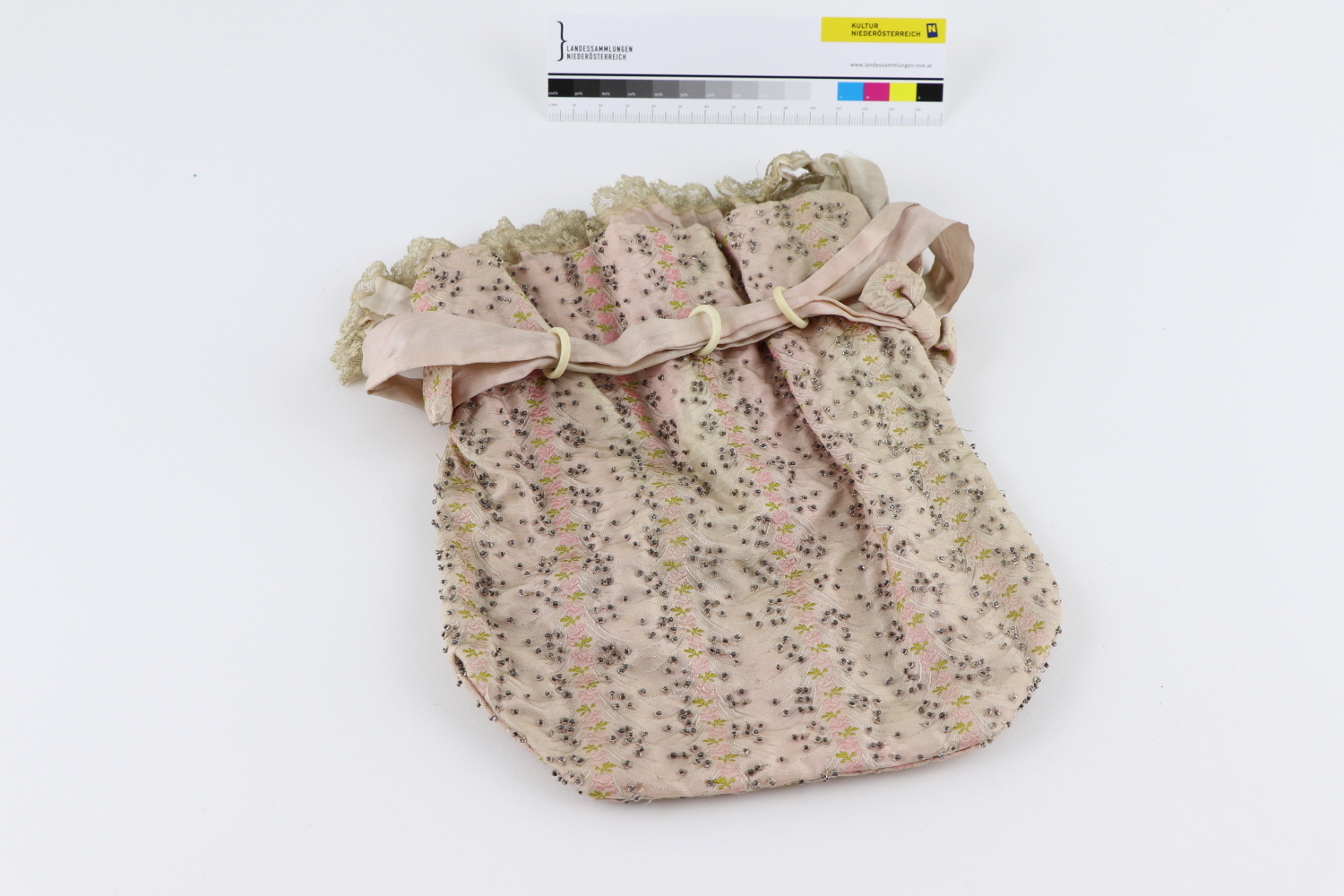 Rosa Seidenbeutel mit Blüten- und Blätterranken, zusätzlich mit Glasperlen bestickt. Der Beuteleingriff ist von innen mit einer Seidenrüsche mit Klöppelspitze besetzt und mit rosa Seide gefüttert. Das seidenen Zugband wird durch weiße Ringe geführt und ist mit Maschen beiderseits fixiert. Der Beutel ist aus einem Stück zugeschnitten und an einer Seite über den Beutelboden zugenäht.