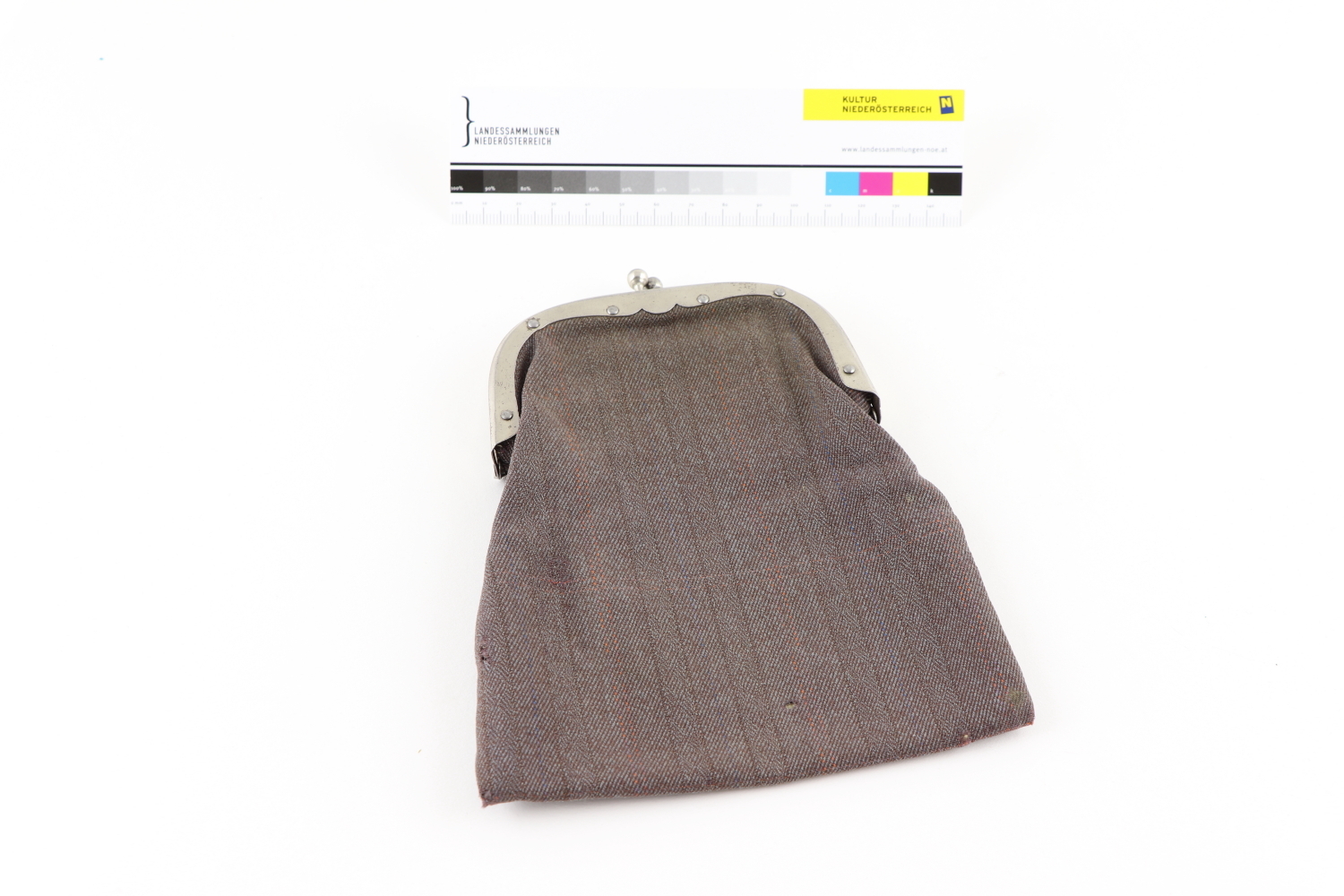 Graubraune Geldbörse aus gestreiftem Wollstoff in Köperbindung mit Metallbügelverschluss.
