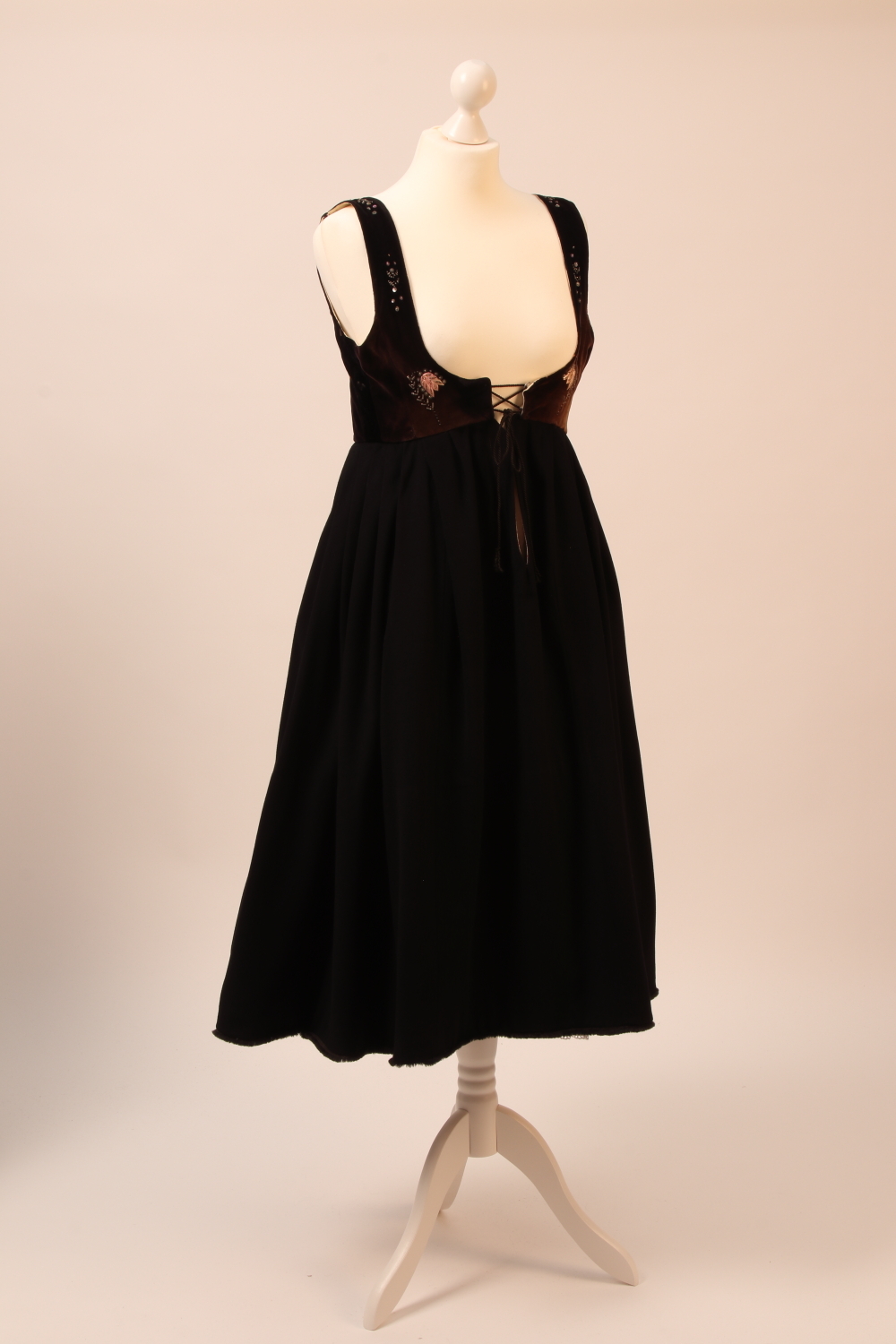 Braunes Samtmieder mit Blumen- und Blättermitiven aus Glasperlen, bunten Pailetten und rosa Seide bestickt. Vorne Ösen an der Innenseite, mit brauner Kordel zu Binden, weißes Leinenfutter. Schwarzer Wollrock in Falten gelegt, mit breitem, roten Innenbesatz und Kittelblech aus schwarzer Borte mit Beserlborte.