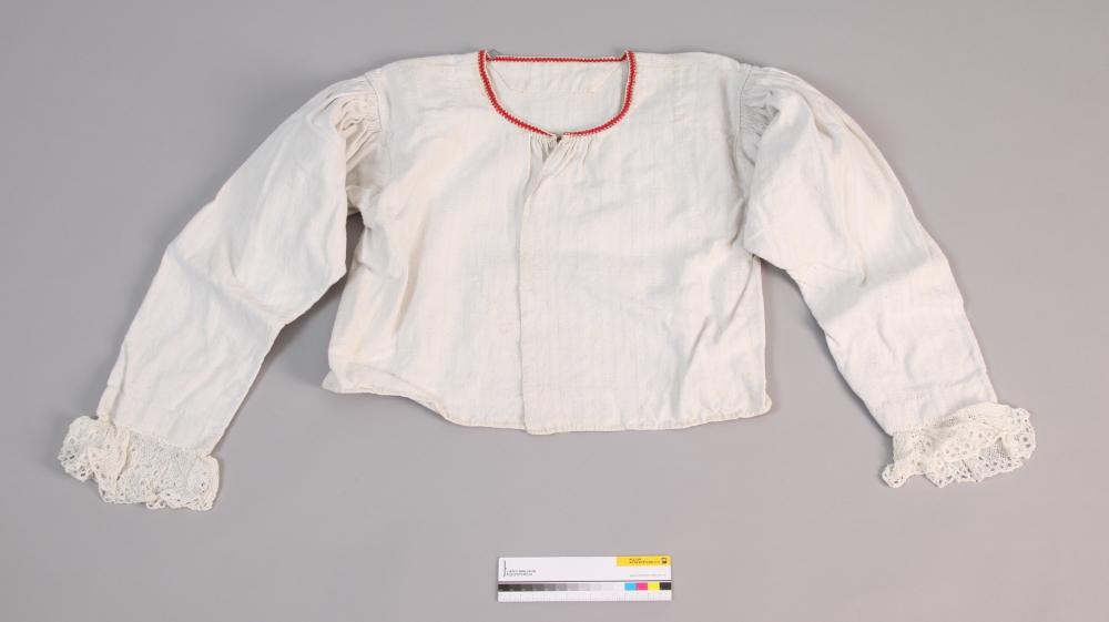 Weiße Dirndlbluse aus grobem, handgewebten Leinen mit langen, gerade angesetzten, reich gezogenen Ärmeln, ohne Kugel, Ärmelsaum mit 7 cm breiter Klöppelspitze besetzt. Halsausschnitt mit roter Webborte eingefaßt, Haftlverschluss.
