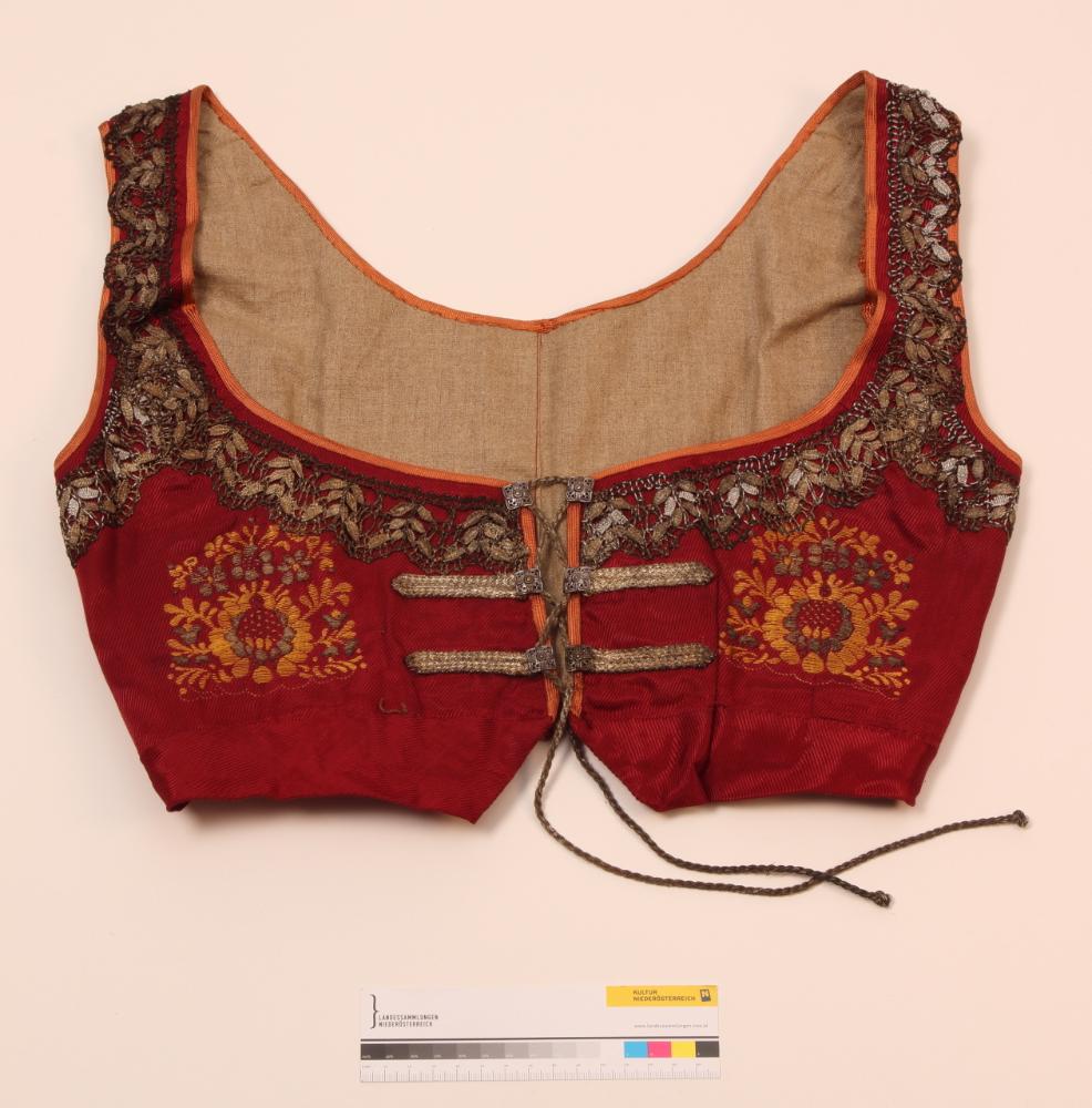 Weinrotes Schnürmieder mit bunten, broschierten Blumenmotiven, Hals- und Armausschnitte mit orangenem Bändchen eingefaßt und mit Goldspitze besetzt. Mit Silberborten und Zierhaken in der Vorderen Mitte und Kordel zum Schnüren. In der Rückentaille vier versteifte Rundbögen "Schitzlan". Naturfarbenes Leinenfutter.