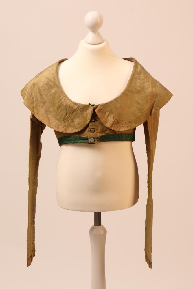 Grün/Rosa changierende Damenjacke in Unterbrustllänge mit großem Kragen und Rüsche am Ärmelsaum. Der Saumaufschlag ist dunkelgrün besetzt und in der Rückenmitte in Stehfalten gelegt. Die Jacke wird mit überzogenen Knöpfen links über rechts verschlossen. Leinenfutter.