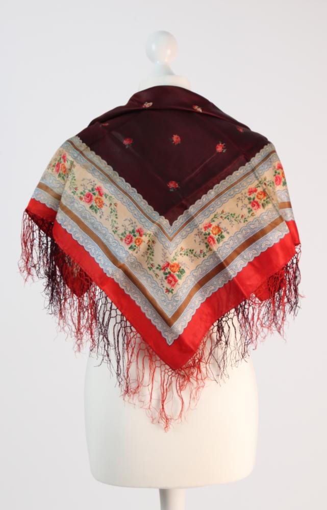 Buntes Tuch mit weinrotem Mittelteil und Rosen, umlaufende hellblau/weiße Bordüre mit Rosenranken und roter Rand. Zwei Webe-, zwei abgesteppte Kanten mit geknüpften Fransen.