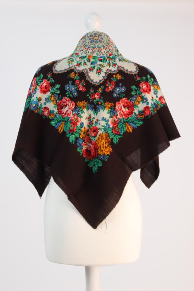 Dunkelbraunes Tuch mit Rosen- und Blumenmuster im Mittelteil und der umlaufenden Bordüre auf weißem Grund in Rot/Blau/Gelb/Grün. Zwei Webe-, zwei Schnittkanten und aufgenähtes Firmenetikett.